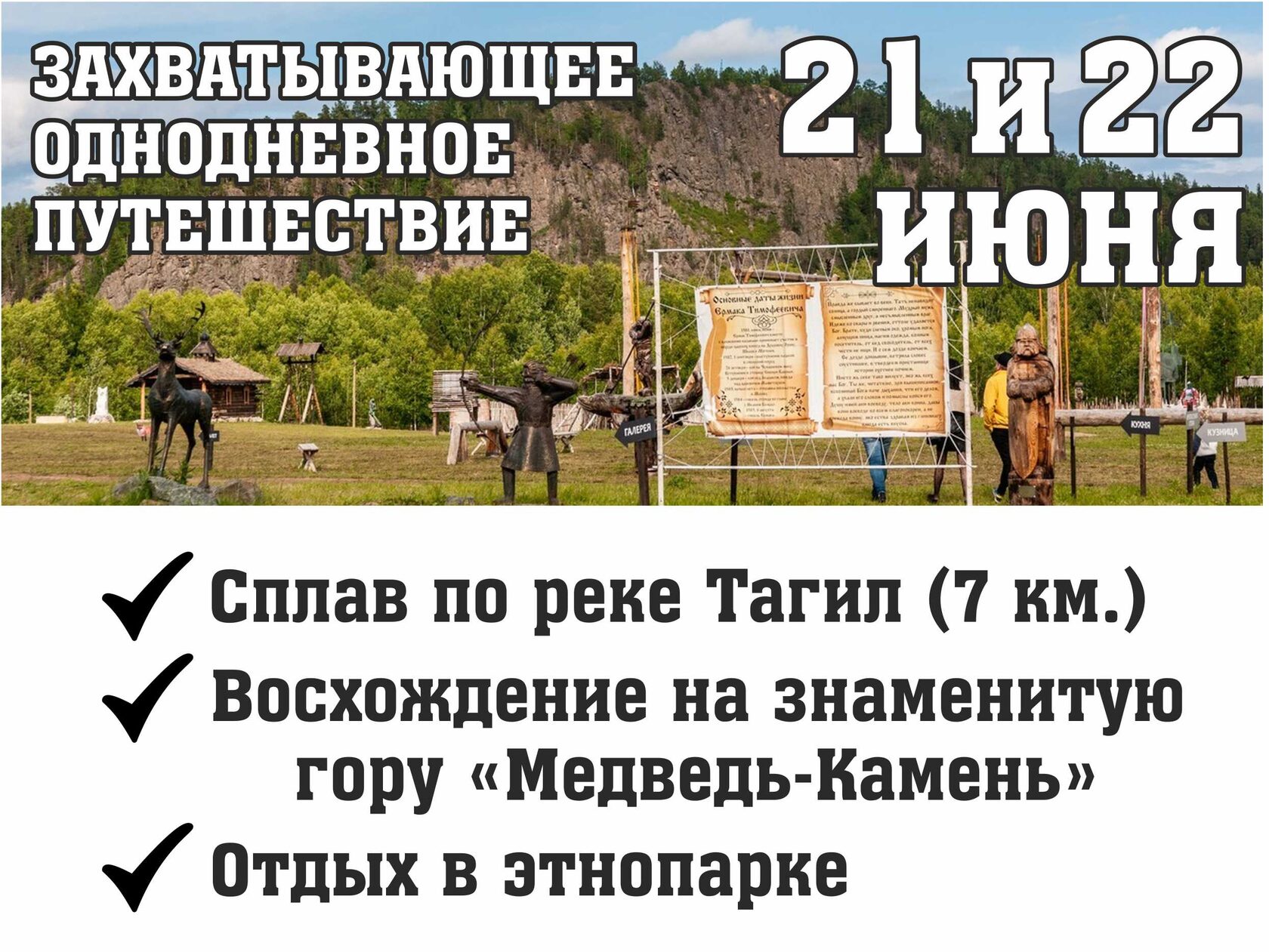 Приглашаем в удивительное однодневное путешествие выходного дня, за которое вы можете сплавится по реке Тагил, забраться на знаменитую гору Медведь-камень. Полюбоваться красотами Урала с высоты птичьего полета. Узнать об истории покорения Сибири.